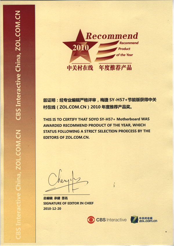 2010-中關(guān)村在線-梅捷H57節(jié)能主板獲中關(guān)村2010年度推薦產(chǎn)品獎