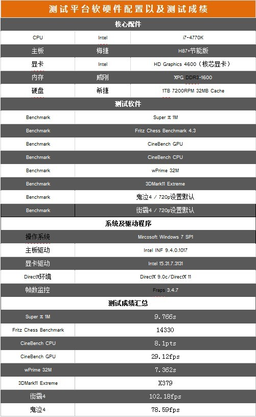 詳細硬件、軟件驅(qū)動、測試項目及測試成績匯總?cè)缦卤硭荆?/p>