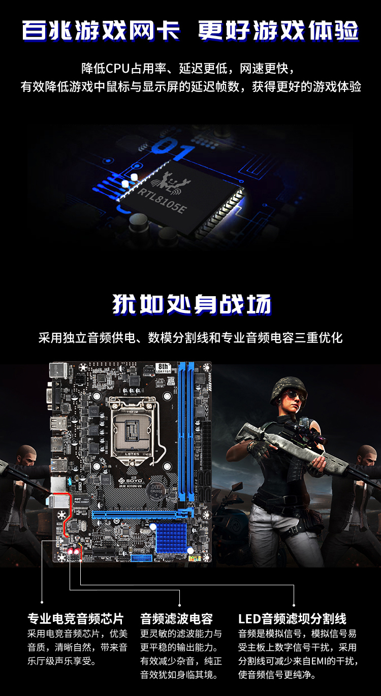 - 扎實供電,DDR4內(nèi)存,音頻分割線,音頻電容,SATA3.0,USB3.1