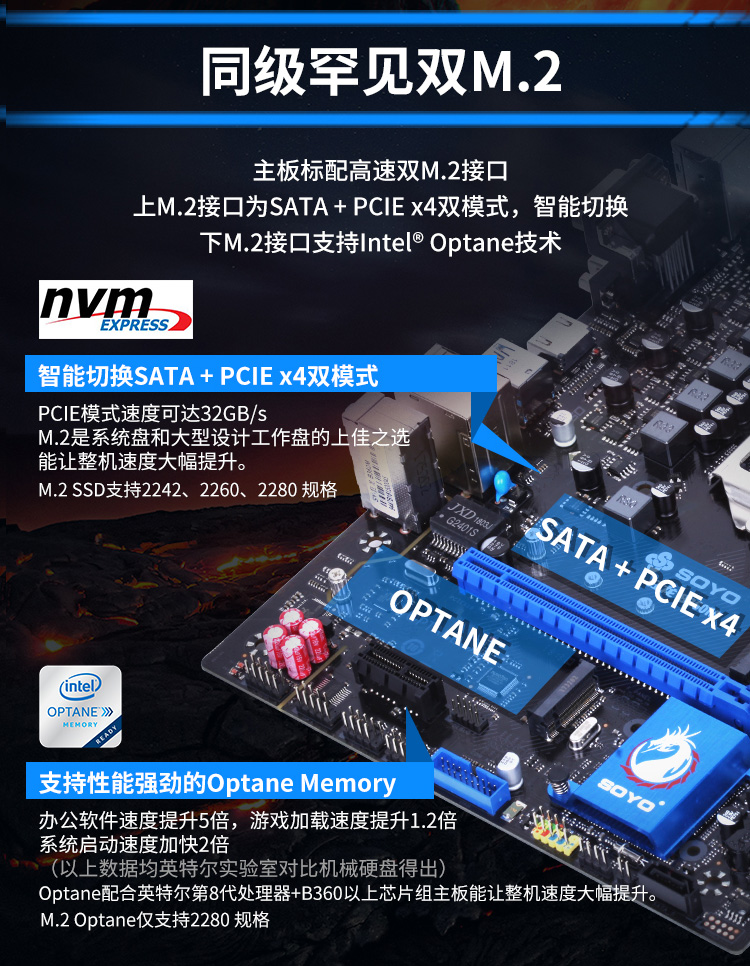 主板標(biāo)配高速雙M.2接口,智能切換SATA+PCle*4模式,速度可到32GB/S。還可支持英特爾Optane加速技術(shù),讓你的機(jī)械硬盤更上一層樓。M.2讓整機(jī)的速度大幅提升,游戲加載速度也大大提升。
