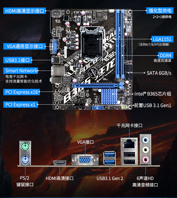 IO接口方面,狂龍B365M-VH的配置中規(guī)中矩,HDMI+VGA的視頻輸出接口,支持雙屏顯示輸出。千兆網(wǎng)卡和USB3.1等基本也是標配的接口了,同時還保留了PS/2鍵鼠接口,這對于使用老式鍵鼠的用戶來說,可謂利好。