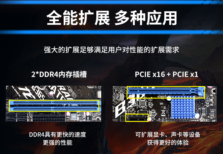 插槽方面,高速雙通道DDR4內(nèi)存插槽和PCIE x16 + PCIE x1插槽,大大增加了后續(xù)的升級和可擴展性,滿足不同玩家的需求。