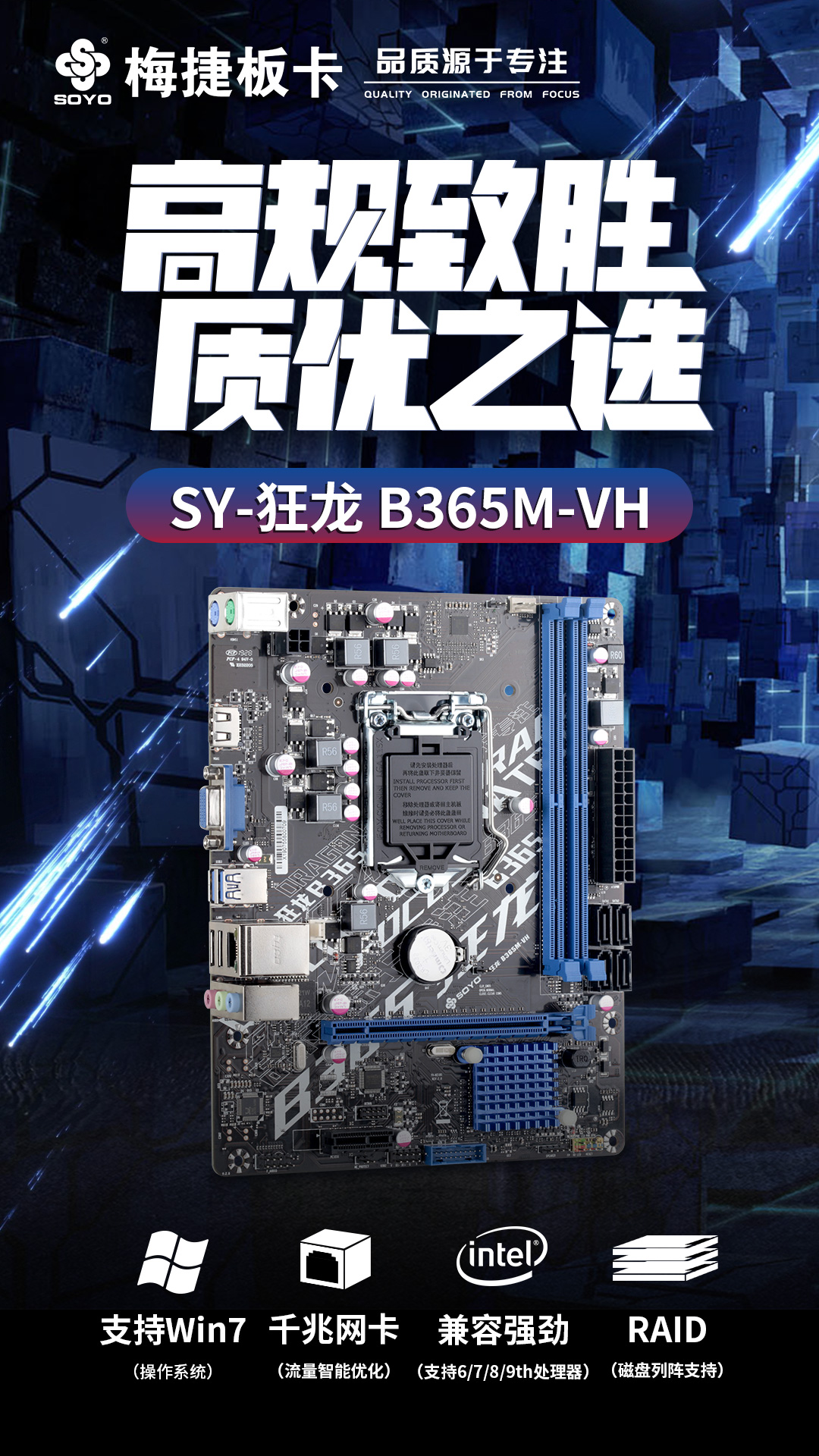 作為主板界老牌廠商,梅捷對于大部分玩家可謂不陌生,梅捷這次推出的狂龍B365M-VH主板,外觀上加入了比較潮流的絲印元素,多個碩大的文字絲印組合,仿佛紋有一身圖騰的部落酋長。