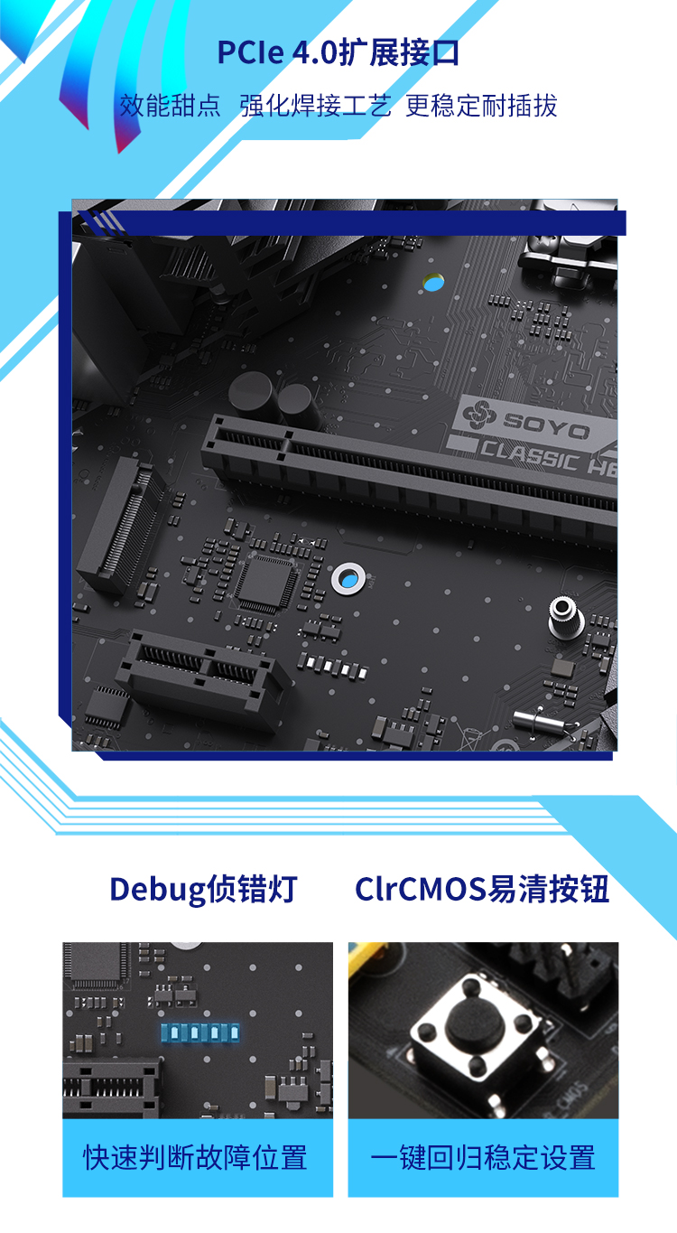 Debug偵錯燈+板載一鍵Clr Cmos按鈕